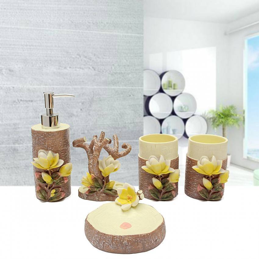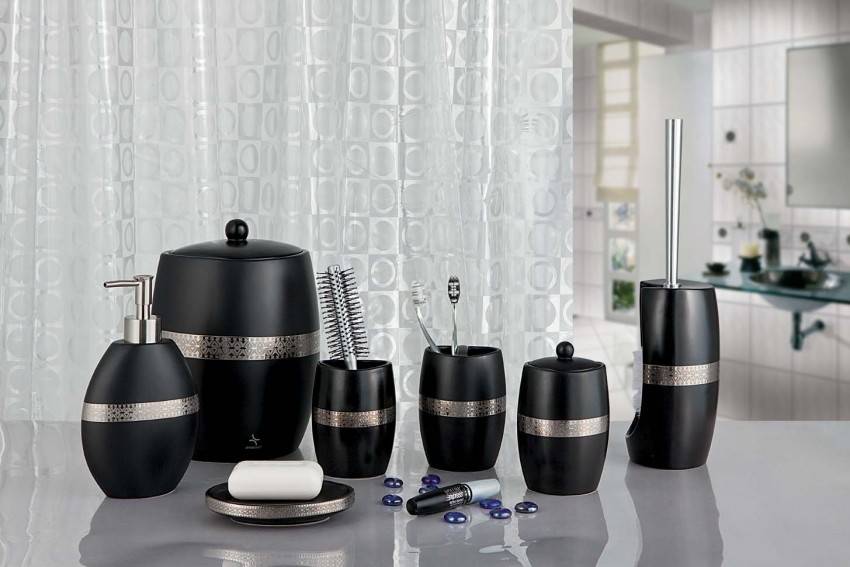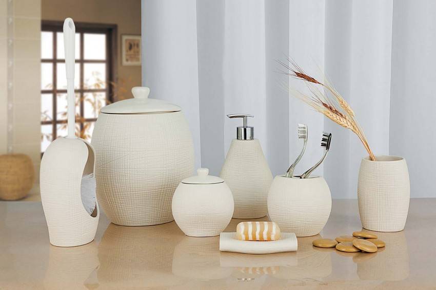 Предметы для гигиенических процедур лучше покупать целым набором. Мыльницы, стаканы, дозаторы и сегодня продаются в самых разнообразных вариантах. Поэтому для ванной в теплых тонах подойдет набор из оргстекла с вкраплениями настоящих листьев и цветов, а морские мотивы дополнят аксессуары из белого фарфора со специальными логотипами.