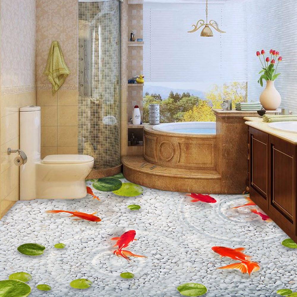 Привычный кафель имеет, как правило, типичный набор узоров, он не считается оригинальным напольным покрытием. А вот заливные полы в ванной в 3д – новое дыхание в векторе организации декора.