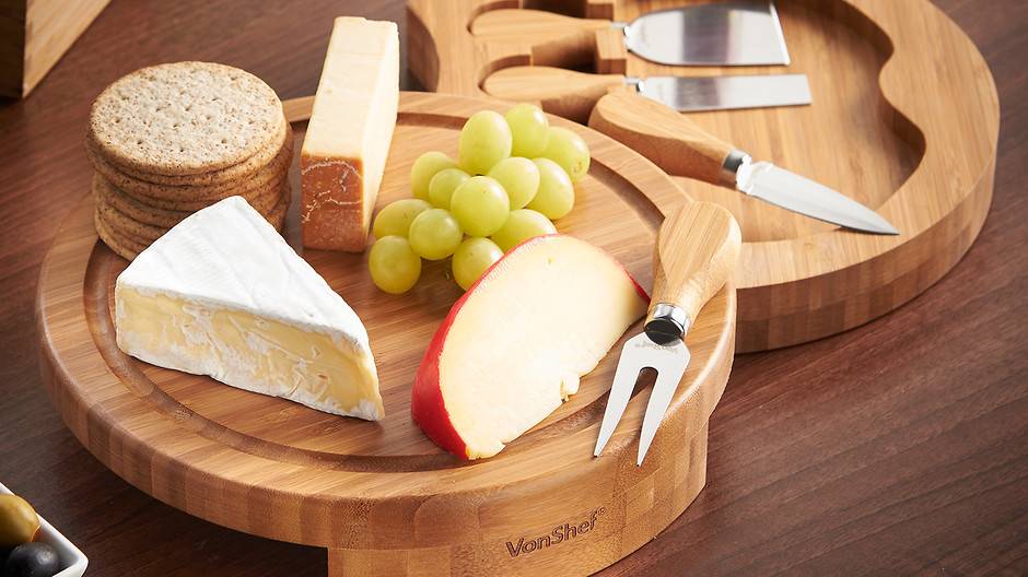 Что касается досок, то их тоже должно быть несколько разного размера. Они не только призваны защищать столешницу во время кухонных работ, но и могут использоваться в качестве сервировочной подставки для нарезки сыров, фруктов и прочих закусок.