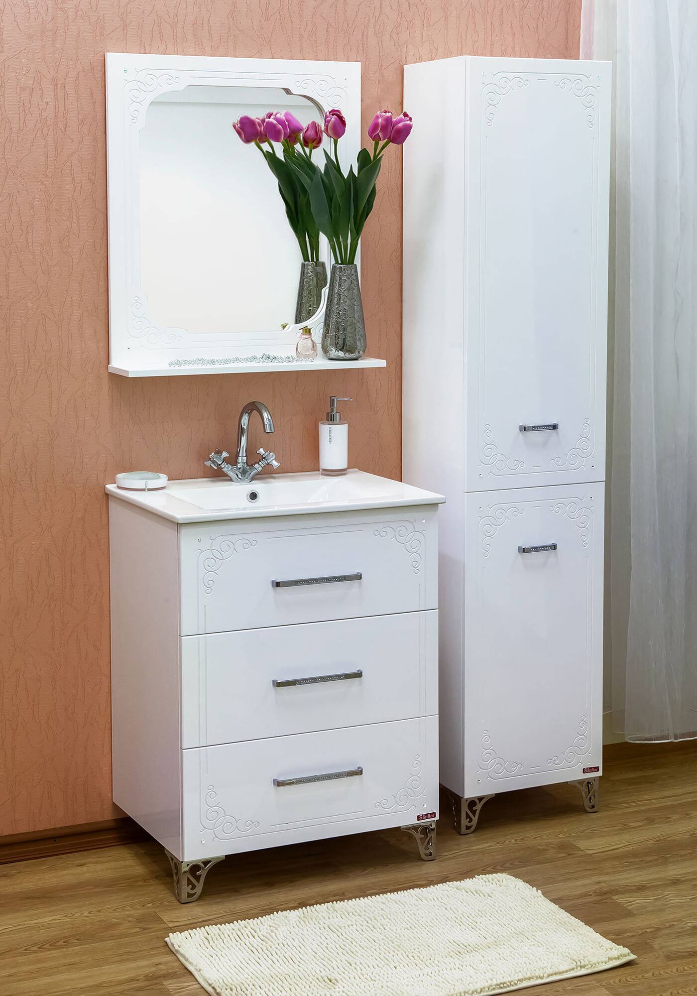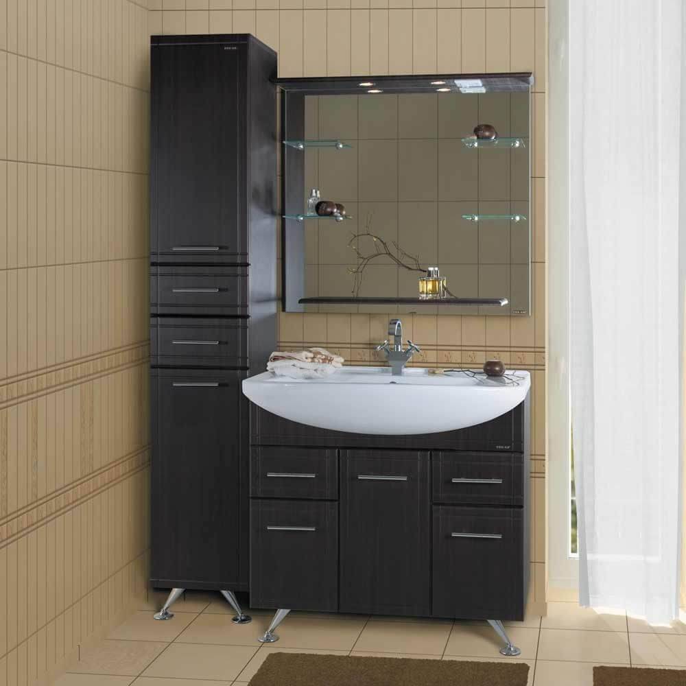 Внутреннее пространство стандартно разбивается на несколько отсеков полками. Часть из них может быть стеклянными. По высоте верхнему отделу отводится примерно треть шкафа. В нем удобно хранить полотенца. Правда это относится именно к закрытым моделям. Еще туда можно составить редко используемые средства по уходу.