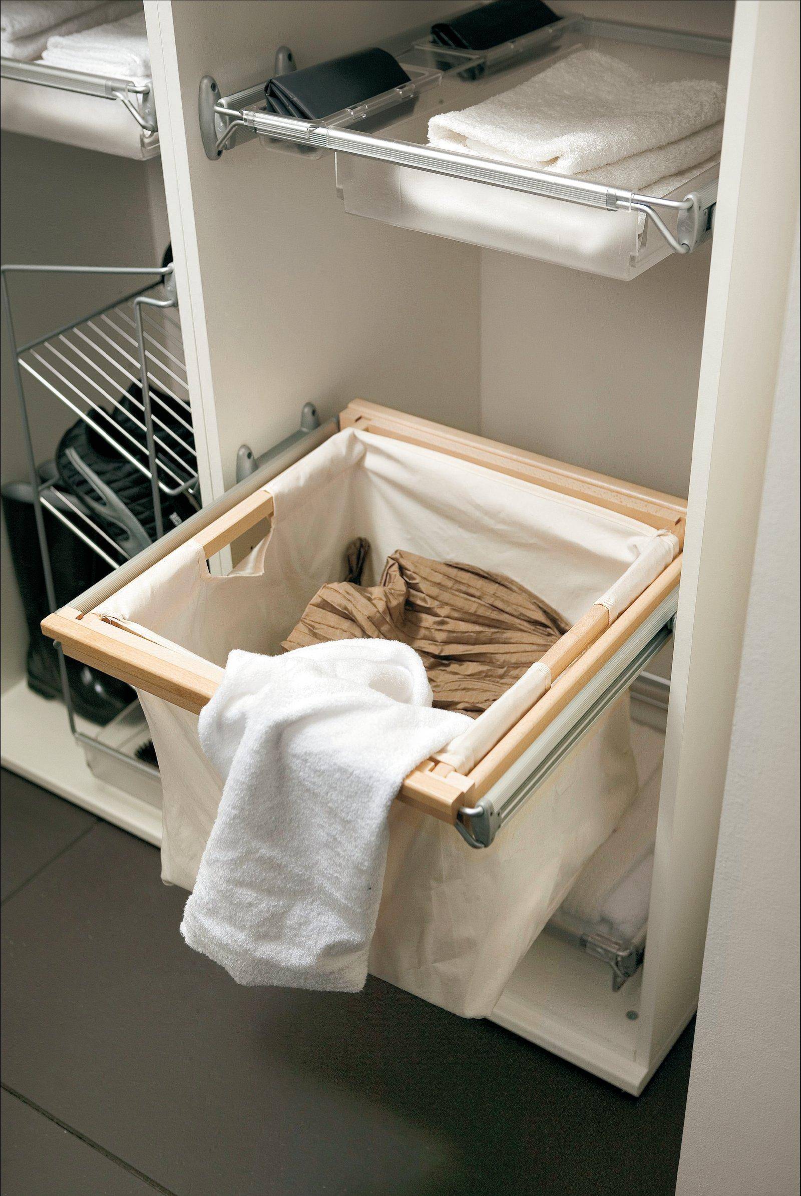 Когда в ванной мало места, но уже есть шкафы или планируете заказывать мебель в санузел, сделайте вот такое удобное решение — корзины в шкаф.