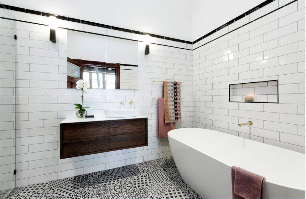 - Классика – керамогранит с имитацией дерева и белые, с частичным декором, стены ванной.