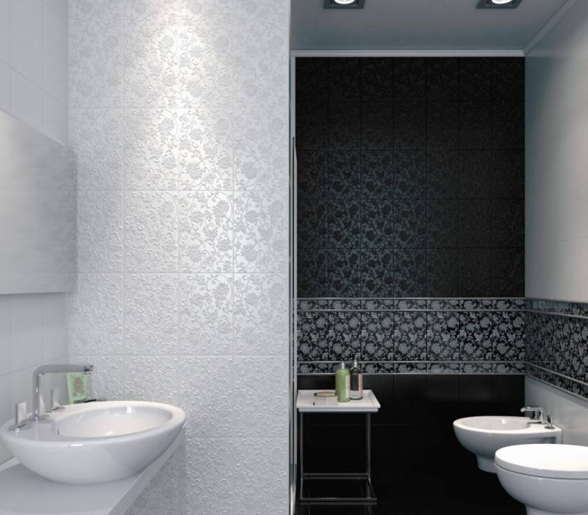 Облицовка может быть симметричной или асимметричной, а также с одиночными черными плитками в качестве декора. Симпатичный вариант получится если оформить низ стены черным, а верх-белым кафелем.