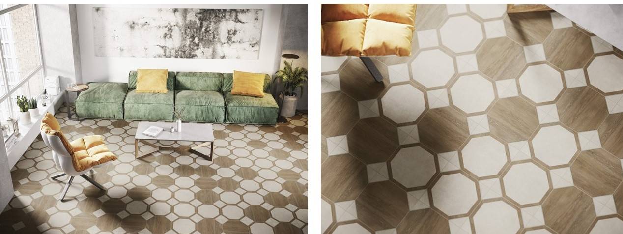 Производители напольной керамики стараются соответствовать новым тенденциям. Поэтому в последние 7 лет в ассортименте практически всех европейских, российских и азиатских брендов появился керамогранит, копирующий по-разному обработанную древесину: лакированную или с потертостями на кромках, брашированную или рустикальную с ярко выраженными выщерблинками, сколами. Можно найти даже покрытие, идеально имитирующее так называемый паркет Recycle Wood (напольный материал, сделанный из переработанной древесины). Проработка настолько глубока, что керамогранит даже тактильно напоминает паркетную планку. Разница улавливается лишь за счет температуры поверхности.