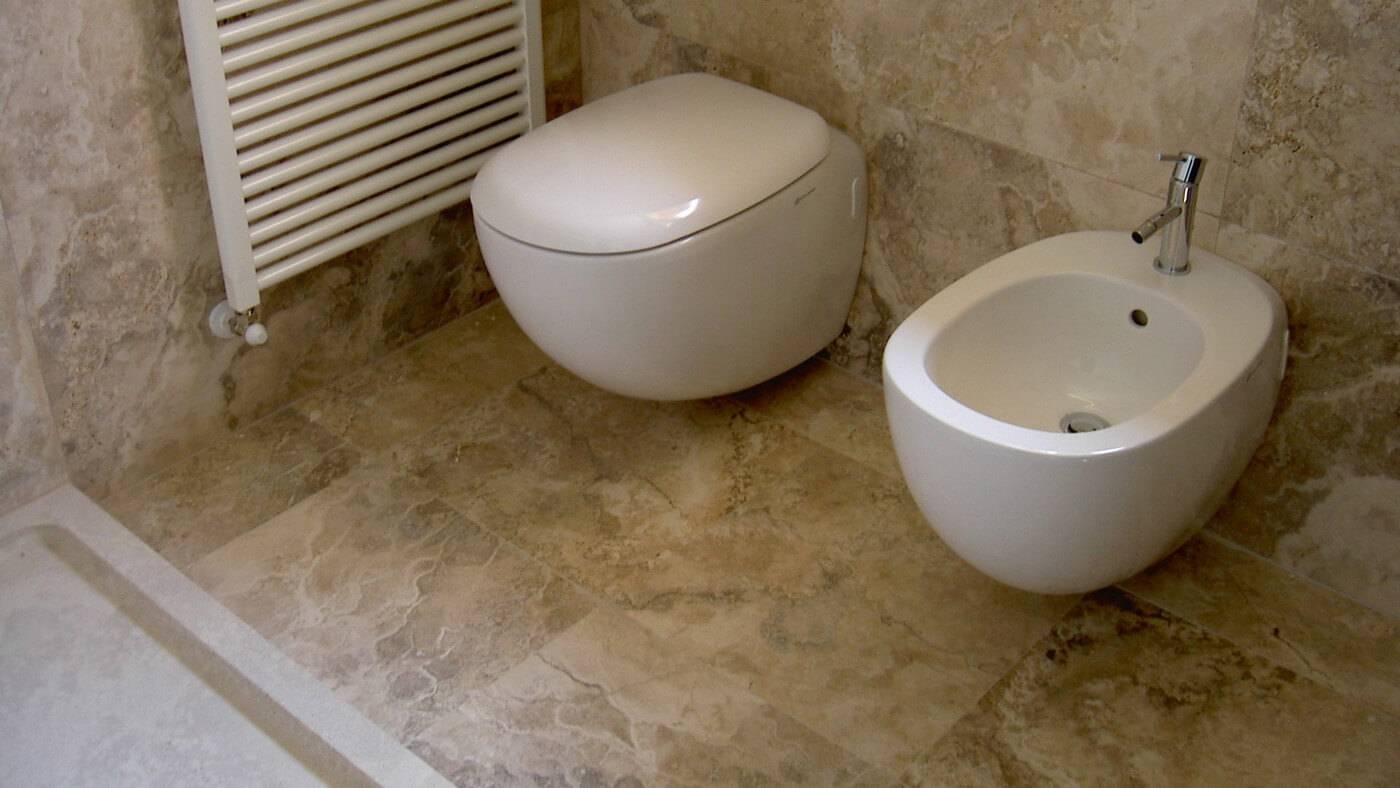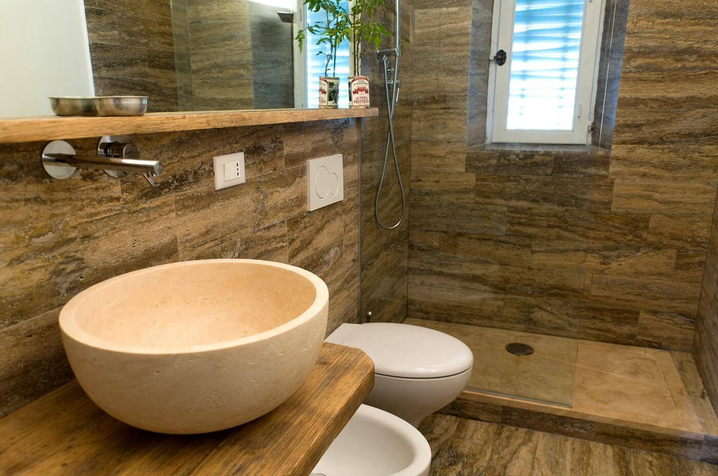 В этом санузле натуральными плитами травертина, родственника мрамора, выложены и пол, и стены