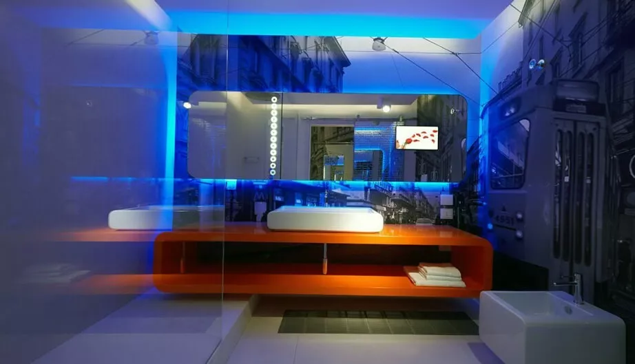 Шикарным видом обладает душевая лейка с подсветкой, создающая цветной поток воды. Не менее необычным решением считается потолок в виде звездного неба или светящихся капель со светодиодными точечными элементами. Для создания оригинального освещения при помощи подсветки декорируют бортики ванной и подиумы, а точечными светильниками оформляют ниши, экраны или плинтуса.