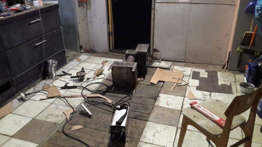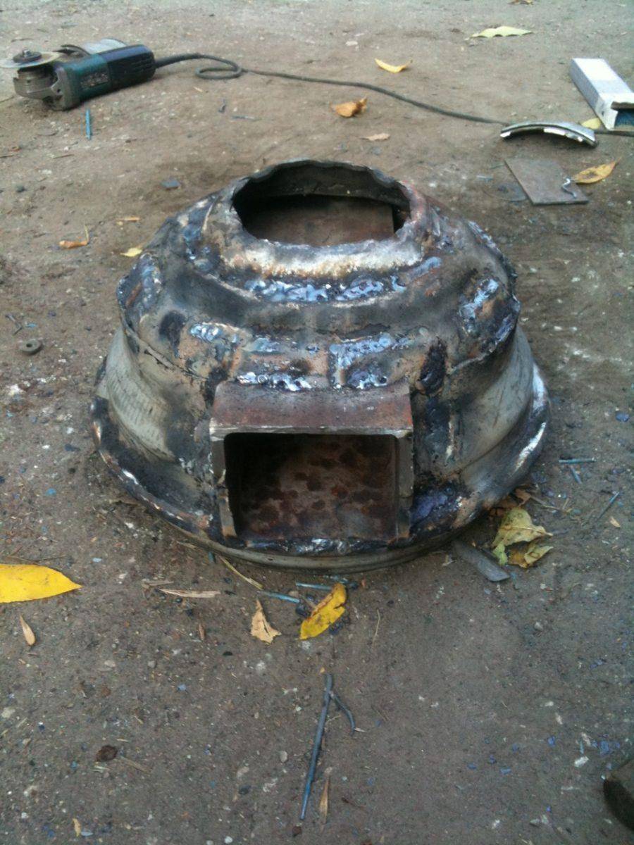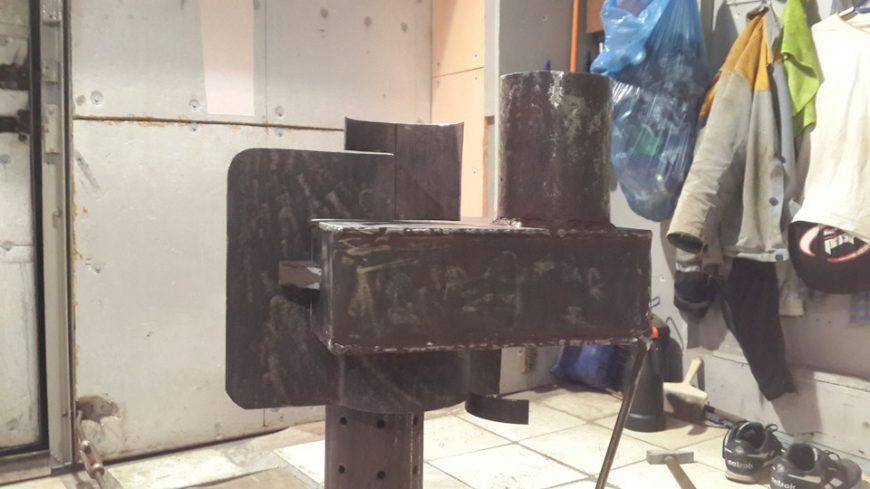 В изготовлении отопительный агрегат несложен: в передней части устанавливаются дверцы, а в задней прорезается отверстие, куда приваривается вторичная камера из трубы или второго баллона. Чтобы не отнимать полезный объем топливника, зольник делается навесным. При необходимости сверху горизонтальной части устраивается варочная поверхность.