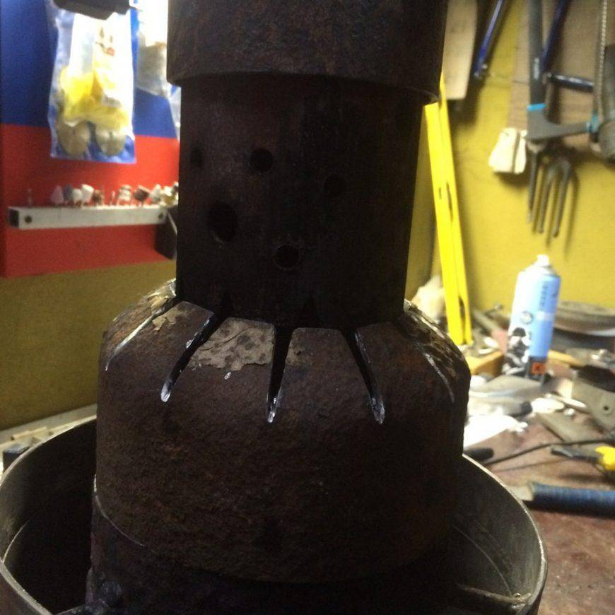 - центральную среднетемпературную камеру (представляющую из себя обычный обрезок трубы с дырками, в которой происходит горение масляных паров);