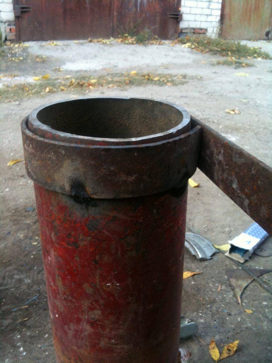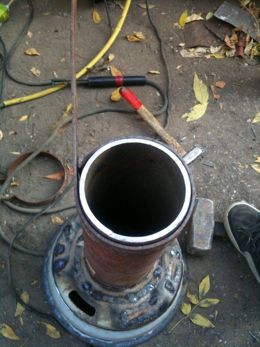 - В верхнем блине заранее делается отверстие под дымоход. Теперь этот круг можно приварить к верхнему краю трубы.