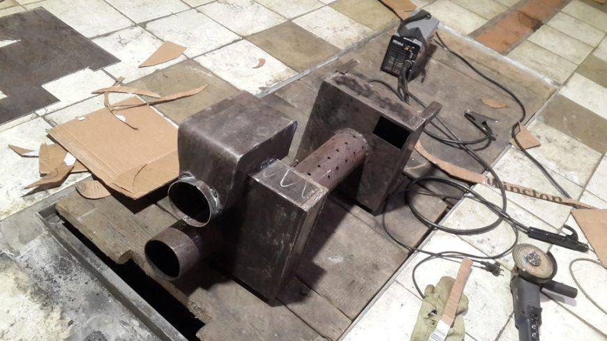 - Теперь с внутренней стороны необходимо прикрепить колосниковую решетку. Ее можно сделать своими руками из стальных профилей, а можно купить готовую. Готовый вариант – это чугунный элемент, который приварить к металлической трубе нет никакой возможности. Поэтому сначала приварите по месту установки упоры (это могут быть уголки или металлическая арматура), а уже на них укладывать чугунную решетку.