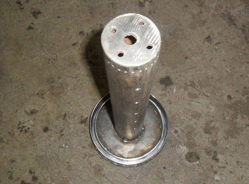 По окружности сделал множество отверстий, чтобы воздух мог спокойно попадать к топливу. Когда все отверстия были готовы, я отшлифовал внутреннюю часть горелки. Вы тоже обязательно сделайте это, т.к. на торчках и прочих дефектах начнет активно собираться сажа.