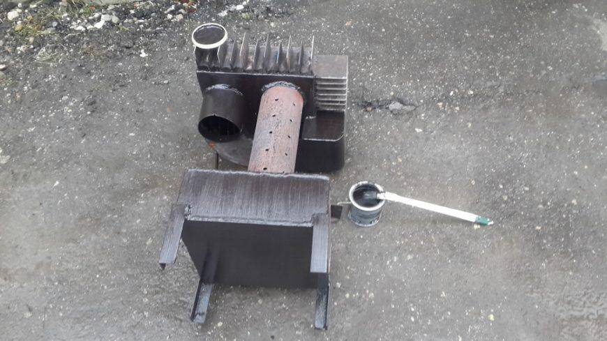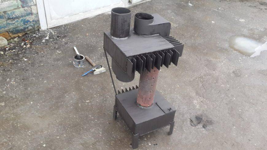 Существуют более простые модели, которые можно собрать своими руками. Буржуйка на отработке из листового железа более компактна и полностью автономна.
