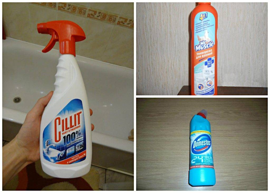 Поскольку межплиточные швы в ванной недостаточно очистить абразивными средствами или металлической щеткой, необходимо использовать специальные средства по уходу за кафелем. Для отбеливания и дезинфицирования можно использовать любое чистящее средство с большим содержанием хлора. Подойдет простой отбеливатель или такие средства, как: