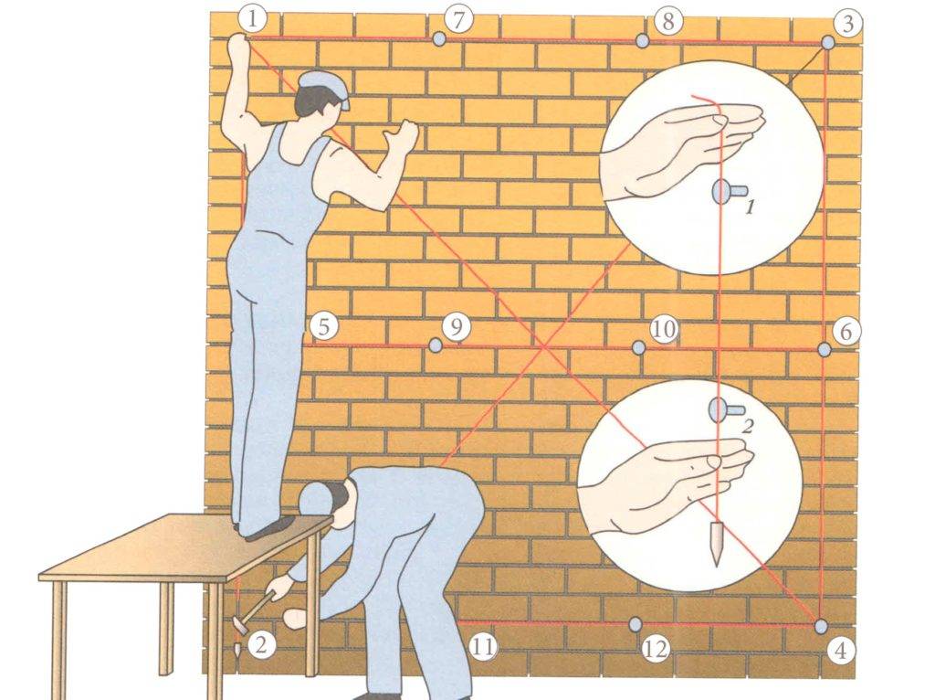 При провешивании расстояние между гвоздями не должно превышать 2 м. На длинных или неровных стенах можно провесить центральный вертикальный ряд маяков. Маяки должны отступать от углов на 10-12 см.