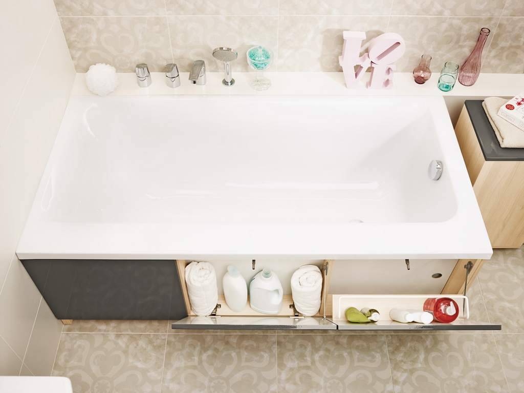 Преимущества декоративной панели с раздвижными дверцами под стандартную прямоугольную ванну очевидны: