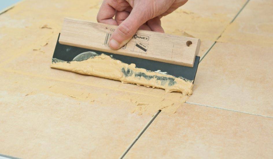 Дополнительно к тому подготавливается растворитель. Это необходимая мера, т. к. затирка быстро высыхает, и при обработке большого участка в некоторых местах останутся пятна. Если планируется делать швы межплиточного пространства с углублением, подготавливают формирователь. Вместо этого инструмента можно применять провод большого сечения.