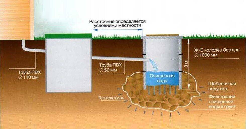 Нечистоты перерабатываются бактериями, вода, которая находится сверху ёмкости, переливается через трубу в дренажный колодец. Из него она поступает через дренажную подушку в грунт.