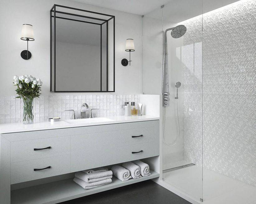 Белое на стенах можно получить несколькими методами. Наиболее популярны настенные плитки — они могут быть маленькими или большими, различной формы, с глянцем или без, с ярко выраженной текстурой, красочным акцентом или минималистичным и гладким. Благодаря множеству типов, вы непременно адаптируете их к своему вкусу и выбранному стилю расположения ванной комнаты.