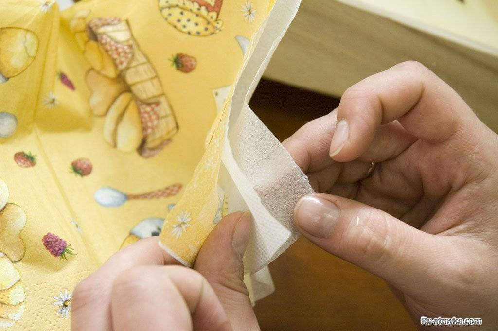 Декупаж – рукоделие, которое под силу даже новичкам. Почему работать бумагой так легко? Потому что работать предстоит только с деревянным или стеклянным изделием и бумагой. Для декупажа подходит разнообразная бумага: офисная, калька, крафт, рисовая, открытки. Использование плотной бумаги предполагает ее предварительную обработку перед основным видом работ. Такая подготовка имеет название истончение или расслаивание.