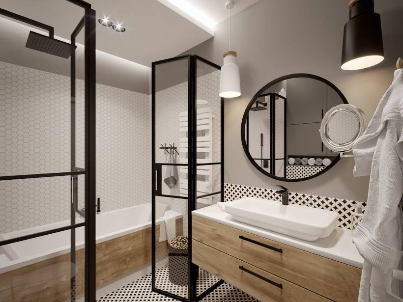 — Если дверь в ванную расположена сбоку — кабинку обычно монтируют или напротив входа, или по диагонали от него.