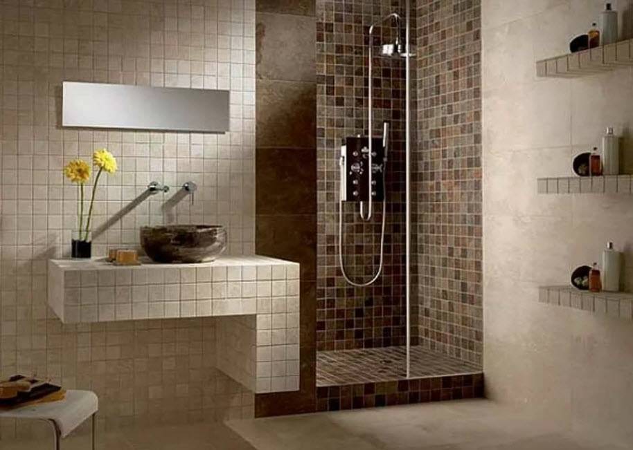 Дизайн ванной комнаты с душевой кабиной, полом и стенами из керамической плитки – уже традиционный прием оформления. Действительно с точки зрения практичности — это оптимальный вариант, особенно для небольшой комнаты. Производители плитки работают с дизайнерами, которые создают авторские коллекции. Как правило, они включают: