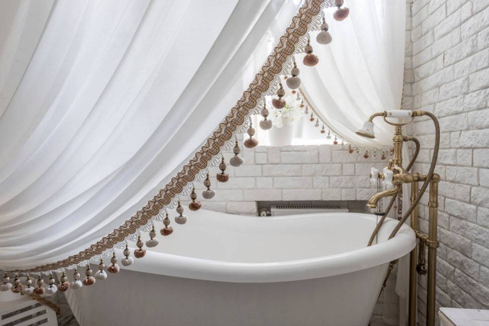 Тюль. Прозрачные, легкие занавески из тюля, колышущиеся на ветру – эффектный декор окна в ванной, который позволяет сделать помещение более приватным, но максимально полно использовать естественное освещение.