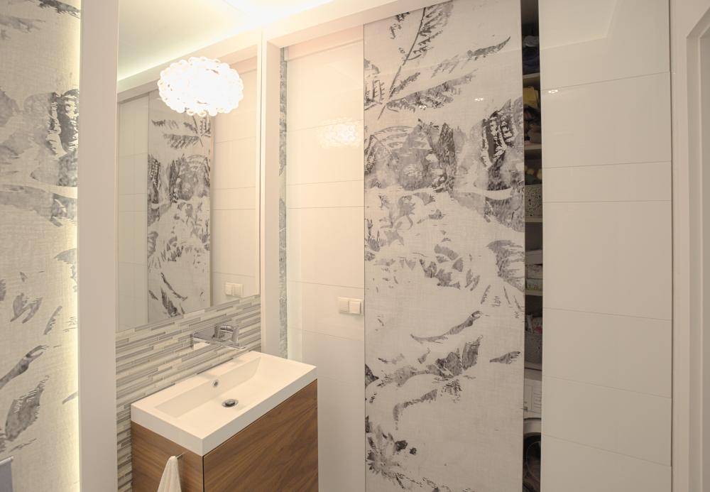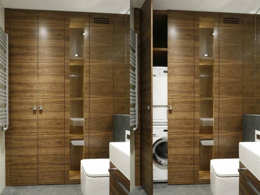 Идеальное решение состоит в том, чтобы отделить часть ванной комнаты для мини-прачечной, в которую вы сможем складировать все аксессуары. Это решение требует много места, но оно достаточно практично. Особенно интересными могут быть раздвижные двери, которые отделяют технику для стирки от остальной части ванной комнаты.