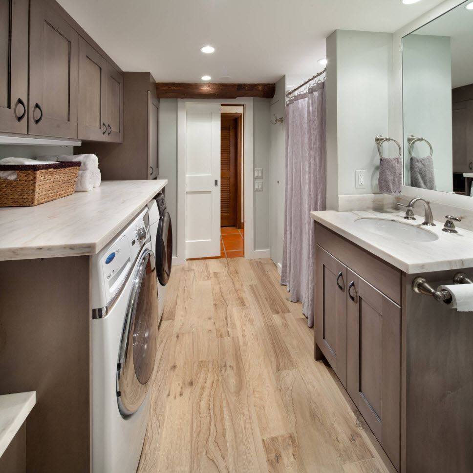 Стиральная машина, стоящая одна в углу, которая не соответствует стилю интерьера, уже не проблема для вас. Выберите одно из популярных решений в фото-идеях и спрячьте машинку за дверью, под столешницей или во встроенном шкафу. Если у вас много места в доме, то обязательно позаботьтесь о своем комфорте, выполняя домашние обязанности. Ведь во вместительном доме или даже в квартире можно создать мини-прачечную, которая станет центром ухода за вашим гардеробом.