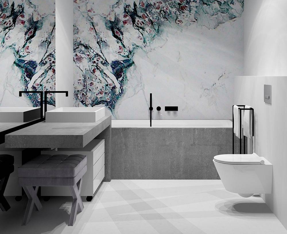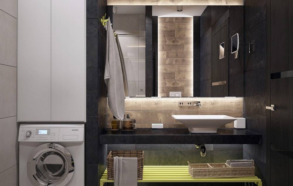 Обрати внимание на моющиеся водостойкие обои. Это не самая обычная фактура для ванной комнаты, поэтому в современном стиле она смотрится интересным и ненавязчивым вызовом