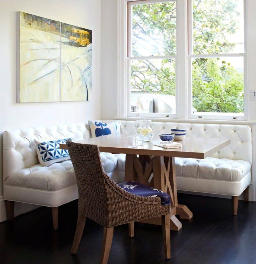 В просторной кухне мягкий уголок используется для отдыха жильцов, он может находиться в отдалении от столовой. В узких комнатах вдоль коротких стен можно поставить два посадочных места, что будет навевать романтику поезда или кафе.