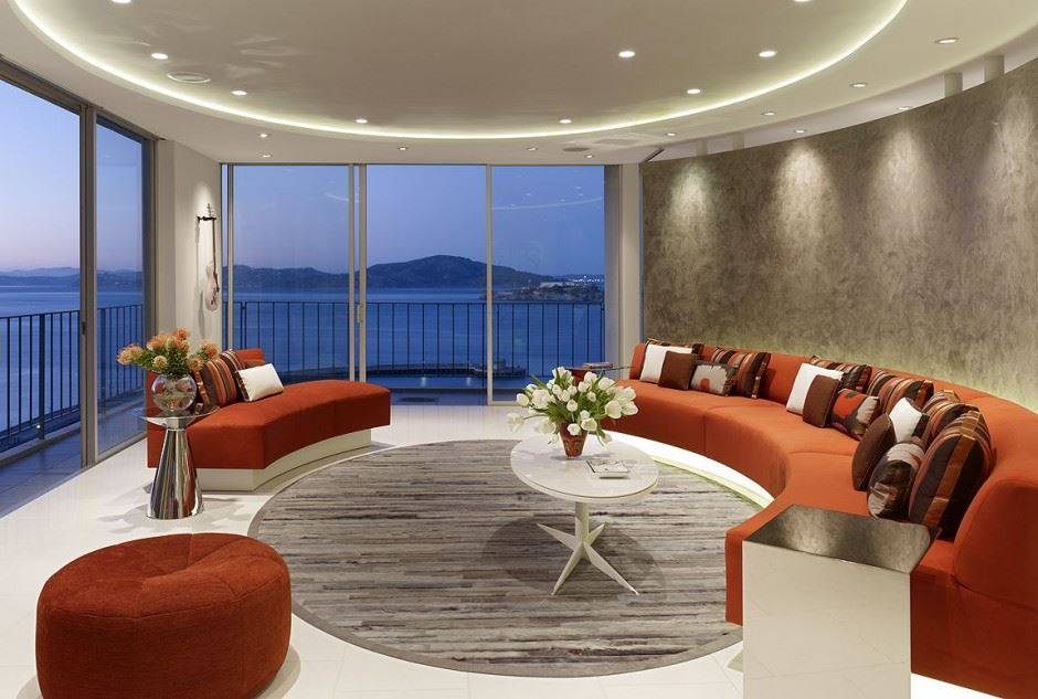 Большой диван, к которому можно подойти с любой стороны, хорошо гармонизирует большое пространство. Он может быть круглым, прямоугольным или угловым; трансформирующимся или нет – планировка будет примерно одинаковой.