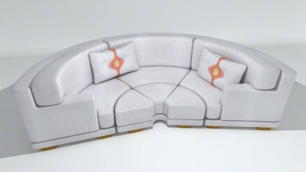 Модульный полукруглый диван превращается в кровать с помощью перестановки блоков в новом порядке. Из сиденья и пуфов собирается спальное место, которое имеет овальную или круглую форму.