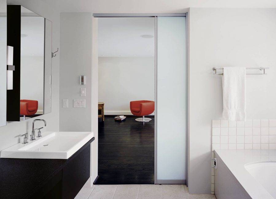 Дополнительно можно поставить надежную защелку. Двери-купе бывают скрытыми, схожими с кассетной конструкцией. Раздвижные системы экономят полезную площадь, но для ванной их выбирать нельзя. Они служат ширмой, чем дверью, не имеют порога, не способны создать достойную шумо- и теплоизоляцию.