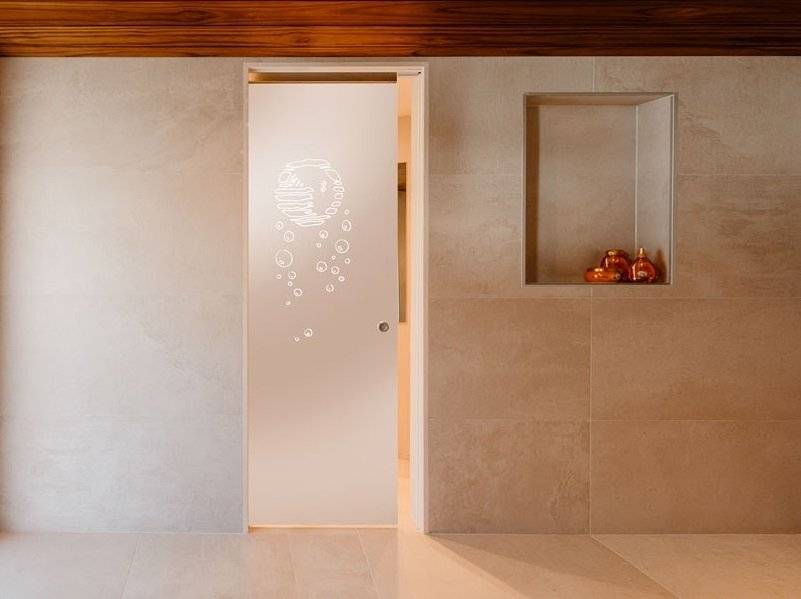 Дверь из матового стекла с узором смотрится очень элегантно в интерьере ванной комнаты