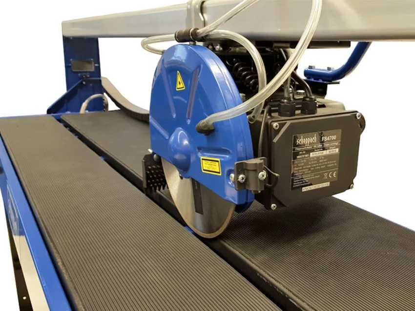Это оборудование имеет мощный двигатель 0,8 кВт. Режущий диск можно наклонять под угол 45°. Скорость оборота диска достигает до 3 тыс. оборотов в минуту. Устройство имеет надежные и прочные ножки. Этот агрегат идеальное решение для объемных объектов по кладке плитки. Важным условием является контроль наличья воды.