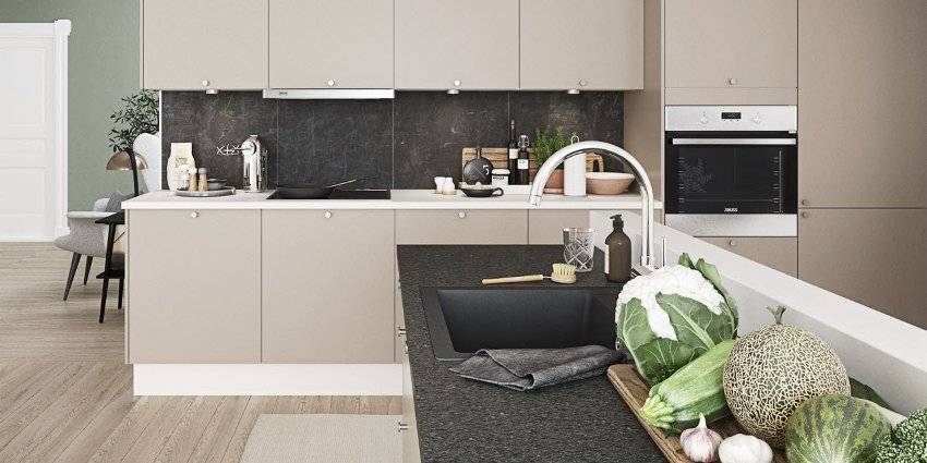 К примеру, выбираем кремовые фасады с фартуками, отделанными под дуб. Этот элемент может откликаться в стульях из того же материала, в ножках стола, декоративном панно на стене или в расцветке дивана. Можно выбрать модные на сегодняшний день сложные оттенки. Именно их предпочитают дизайнеры в современном интерьере. Элемент цвета “пепел розы” может перекликаться с сидушками удобных стульев. Можно использовать такие оттенки с красивыми названиями, как кофе с молоком или лазурно-серый.