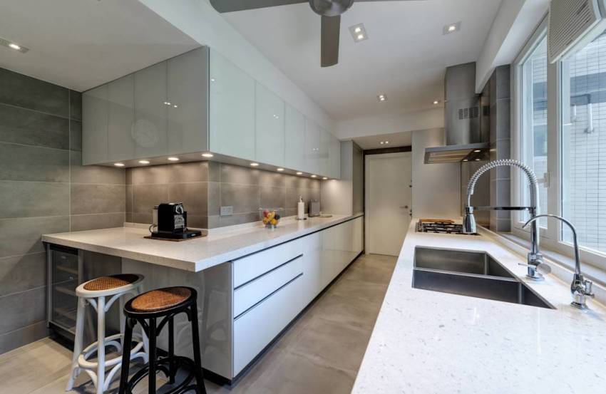 Этот прием идеально подойдет для кухни-гостиной, когда акцентировать внимание нужно на гостиной, а не на рабочем пространстве кухни. В этом случае отделать фартук лучше не плиткой, а, скажем, стеклянной панелью или покрасить стену в этой области специальной влагостойкой краской