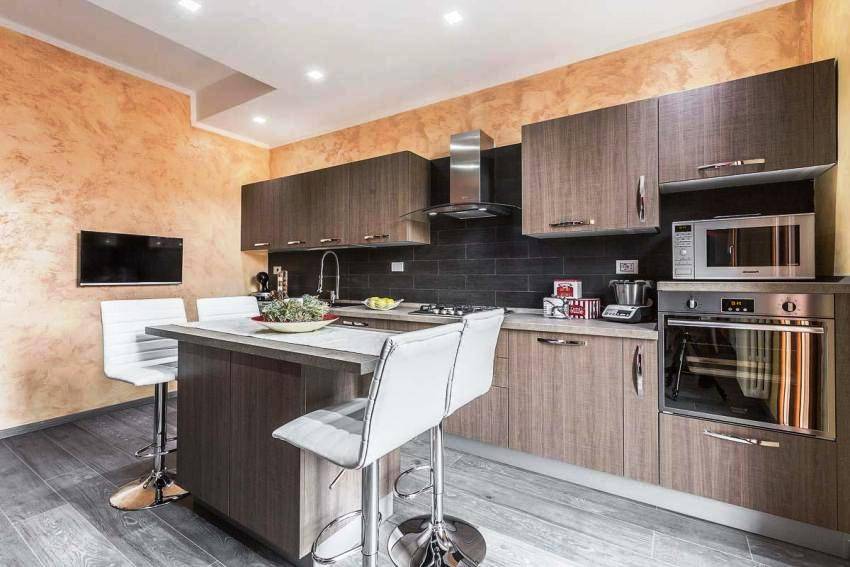 Очень красивое фактурное покрытие, но категорически не пригодное для отделки стен возле рабочей поверхности в кухне. Даже от воды на нем могут остаться некрасивые пятна, что уж говорить о жире, брызгах сока и т.д. Причем привести в порядок штукатурку не так-то просто, как кажется. Ее можно использовать на любой стене в кухне, но не в зоне фартука, если вы не хотите неухоженную и неопрятную кухню.