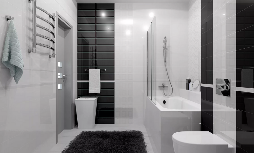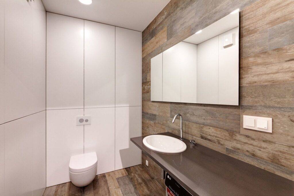 - Бытовая техника, например, стиральная машина или водонагреватель, должна быть спрятана в ниши или установлена снаружи комнаты.