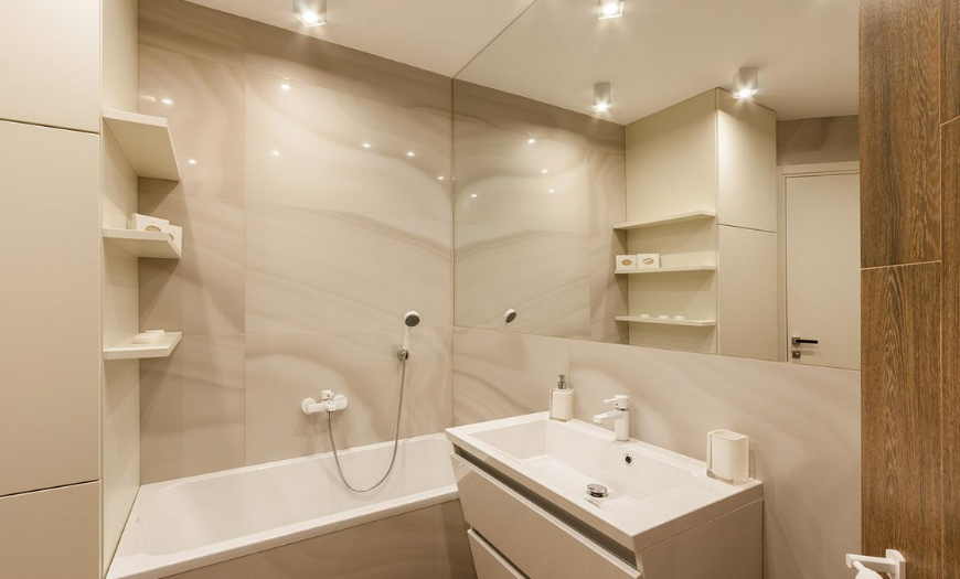 С целью обеспечения достаточного количества света в ванной дизайнеры советуют использовать точечные светильники.