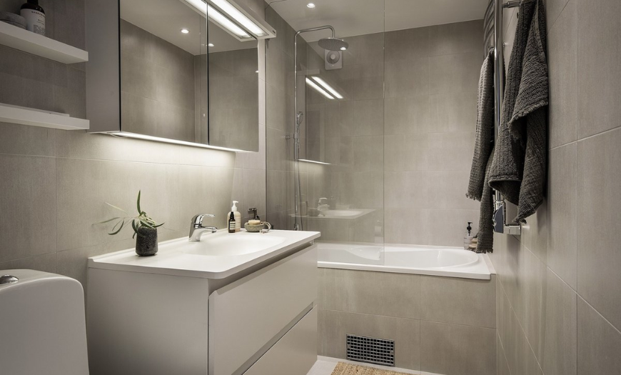 Современный дизайн маленькой ванной комнаты: места для хранения