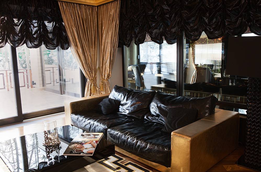 На втором этаже находится спальная и рабочая зона. Здесь расположился кабинет певца. Супруга постаралась и сделала так, чтобы шансонье чувствовал свою ценность, осознавал то богатство, которое он зарабатывает и привносит в семью. И добилась она этого изобилием строгого черного цвета и роскошного золотого.