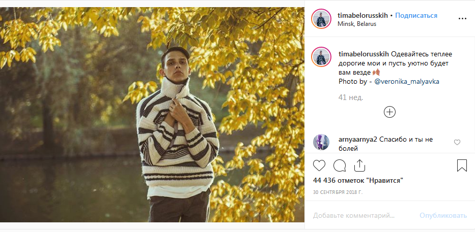 Не так давно Тимофей загрузил в свою социальную сеть около 6 треков. Судя по надписи к этому посту, Белорусских записал музыкальные композиции в 2016 году.