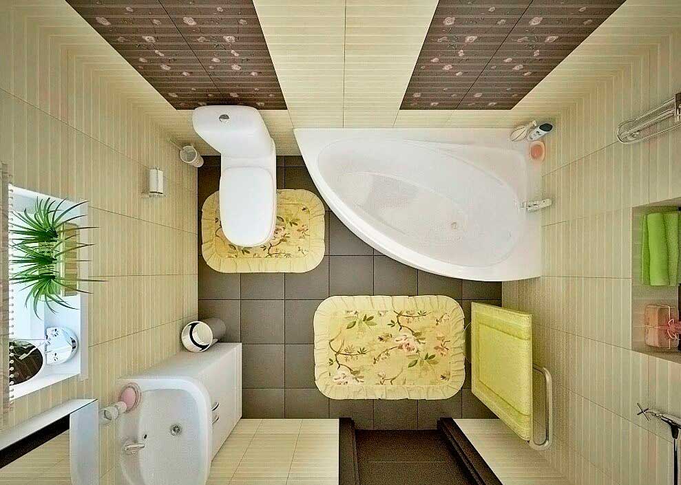 Этот вариант подойдёт даже для очень небольших совмещённых санузлов (площадью 4 кв. м. и менее). Для монтажа ванной требуется не менее 5 кв. м