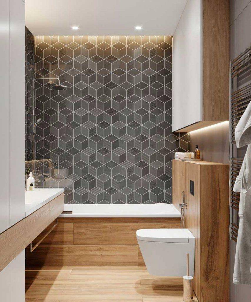 - Подбирая отделочные материалы, можно зонировать пространство, выполнив дизайн ванной и туалета в разных цветах. Проще всего это сделать с помощью плитки. Тёмный вариант хорошо подойдёт для туалета. В зоне умывальника, ванны и душевой кабины более уместна светлая отделка. Высыхая, водяные капли оставляют пятна соли, и на тёмной плитке они будут слишком заметны.