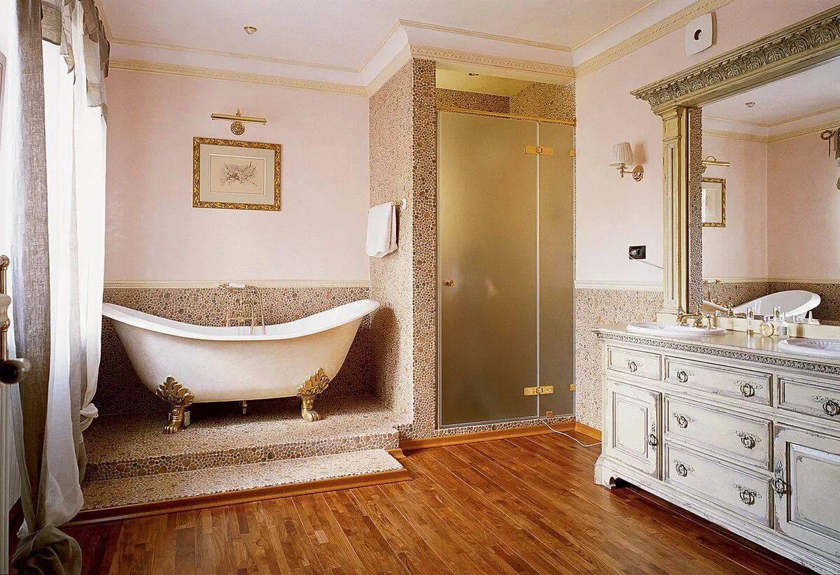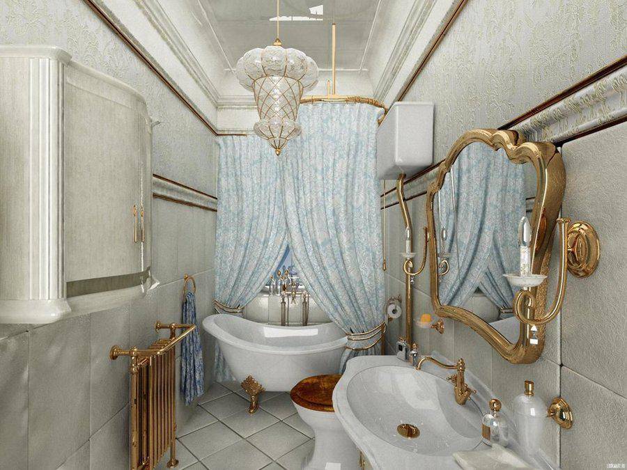 Так как для него характерны просторные интерьеры с помпезным крупным декором и дорогим оформлением. Другой вопрос ванная с мотивами классики. В этом случае даже в небольшой комнате его можно реализовать. Оформив соответствующим образом стены и пол, а также установив соответствующие аксессуары.