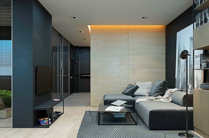 Стены нельзя делать полностью тёмного цвета даже в просторных помещениях, иначе это будет угнетать, быстро надоест. Допустимо выделить какую-либо зону или одну из 4 стен более тёмным оттенком. Из материалов подойдёт: