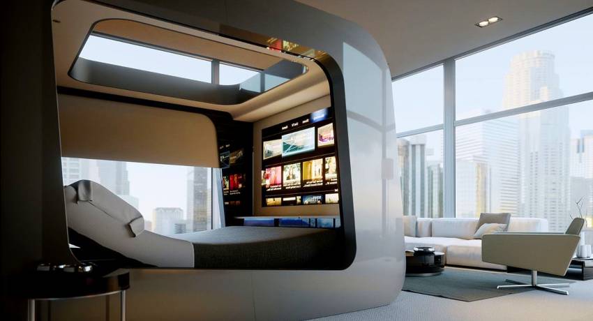 При соблюдении принципов хай-тек в спальне приветствуется кровать с автоматической регулировкой изголовья, а освещение – с регулировкой яркости. Вещи должны храниться в шкафу, который спрятан за перегородкой в стене.