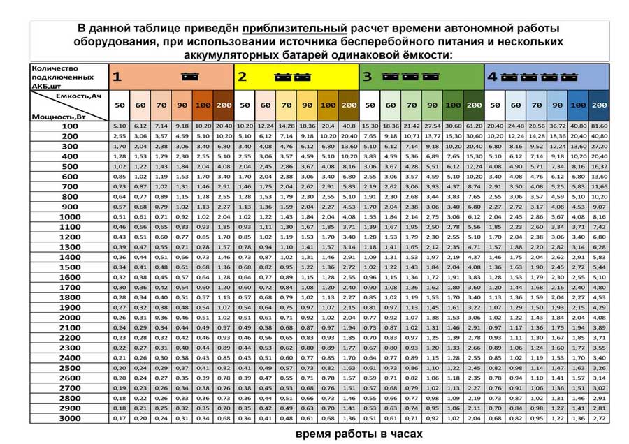 А как долго будет работать выбранный ИБП в автономном режиме? Здесь все зависит от аккумуляторов. Вот таблица с характеристиками емкости батарей и подключаемой нагрузки: