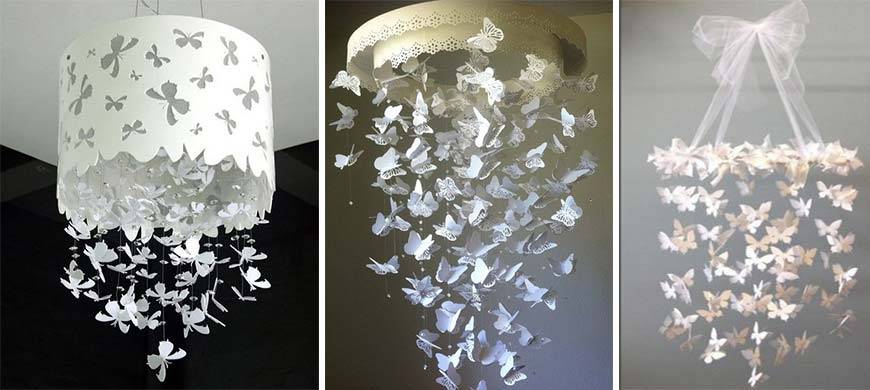 Наиболее распространенным вариантом изделия является люстра с бабочками. И это неспроста. Начнем с того, что такой вариант выглядит роскошно и дорого, а во-вторых ее изготовление не требует особых физических затрат. Таким образом, в создании люстры может участвовать даже ребенок.